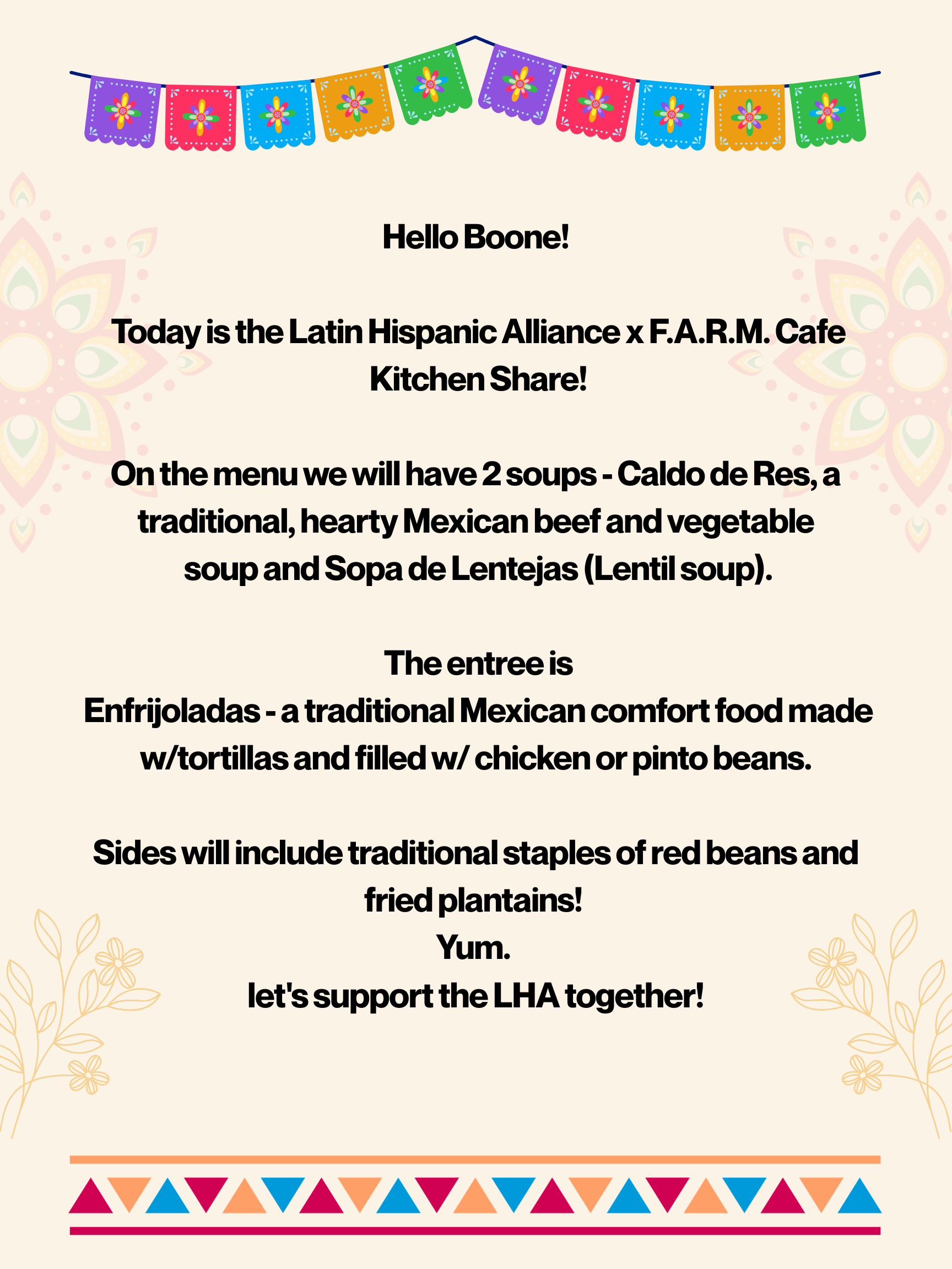 Hello Boone! Today is the Latin Hispanic Alliance x F.A.R.M. Cafe Kitchen Share! On the menu we will have 2 soups - Caldo de Res, a traditional, hearty Mexican beef and vegetable soup and Sopa de Lentejas (Lentil soup). The entree is Enfrijoladas - a traditional Mexican comfort food made w/tortillas and filled w/ chicken or pinto beans. Sides will include traditional staples of red beans and fried plantains! Yum. So come on in and let's support the LHA together!