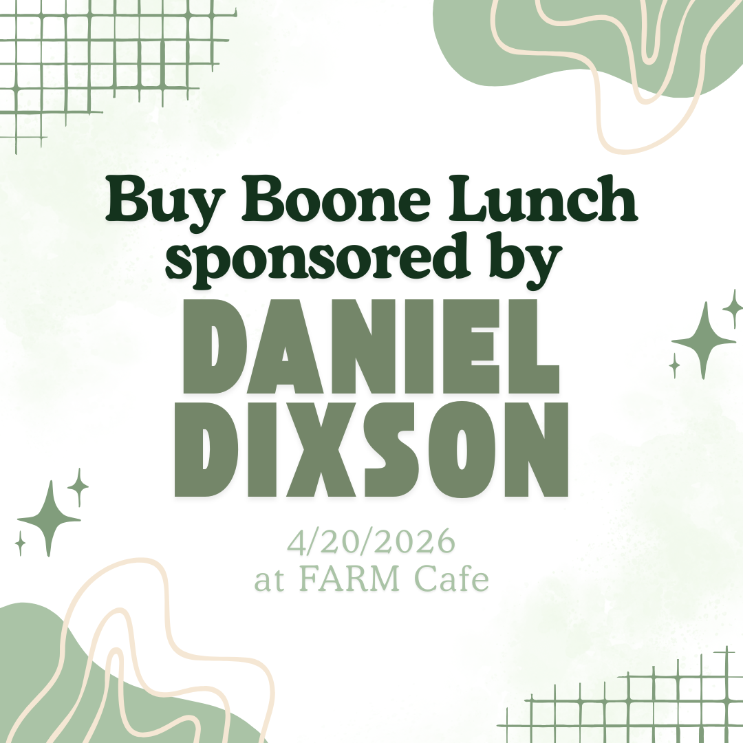 The FARM Cafe staff are honored to host today's Buy Boone Lunch, sponsored in memory of Jack Kearney. Jack was a member of the FARM community, dining with us almost daily and always willing to chat with staff or swap music recommendations while sharing a meal. We are so touched to be included in his celebration of life and welcome his family and loved ones as they sponsor today's meal in tribute to Jack. Their generosity helps to cover the costs of today's meal, allowing all donations to pay-it-forward to help others. We hope to see you all soon.